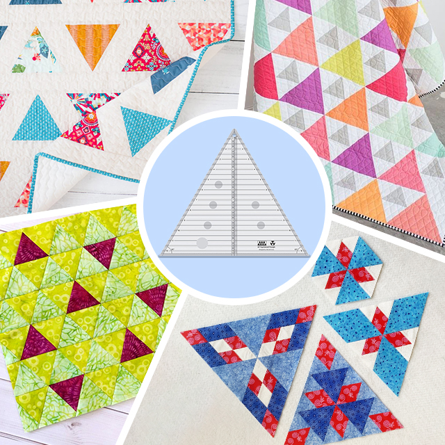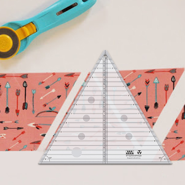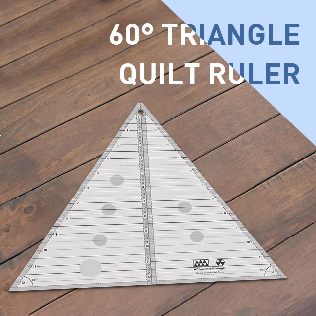 Cut 30 and 60 degree angles up to a finished height of 8 inches. This 60 degree equilateral triangle features easy to read black and white markings. A 1/4 inch dashed line is printed on each side of the center vertical line so you can cut 30 degree triangles that include the seam allowance.