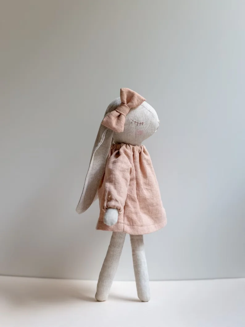 Sewing and filling 🧵: Sew the bunny's body, stuff it with cotton, and then put on the skirt and bow.