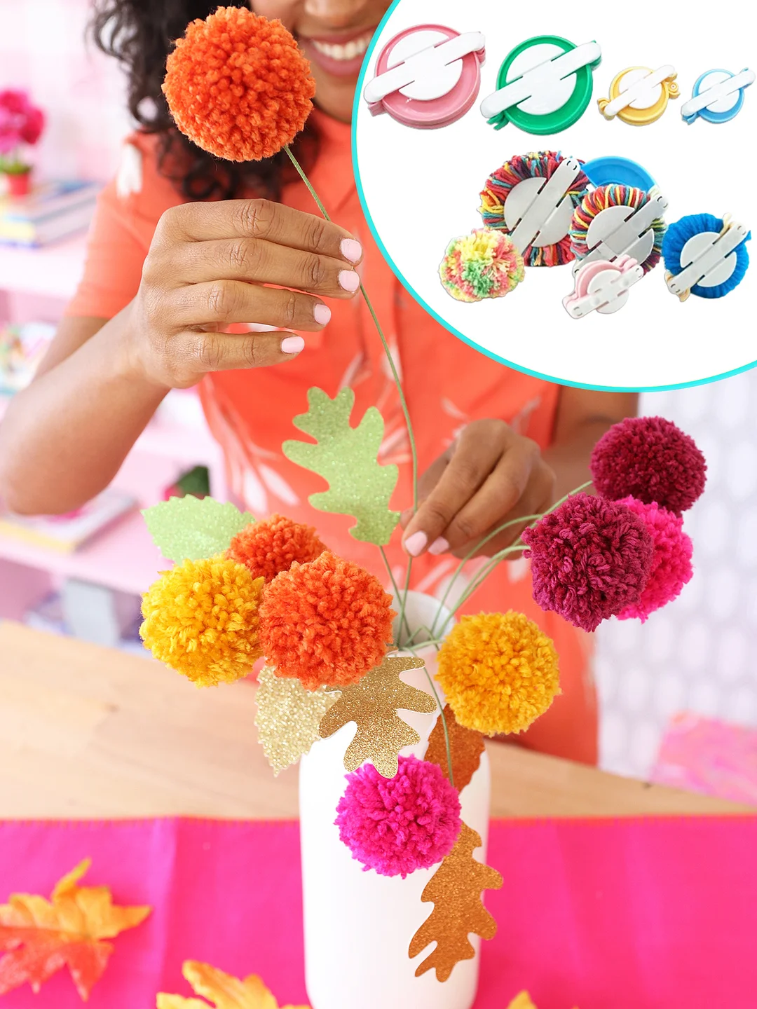 Add a little magic to your everyday essentials with ease using the Pom-Pom Maker! It can help you makeholiday wreaths, bouquets,rugs, hats, dolls and more.