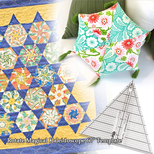 How to use the Kaleidoscope template: Add your own unique variations to the basic runner: 60-degree geometric twists, segmented curves, and even fully reversible designs. Use with your choice of solid colors, prints, batik, or even wool fabrics. (with detailed tutorial)