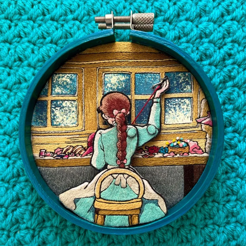 About the mechanism: I used that metal part so that I could actually use the thread she was sewing, so I wasn't too disappointed with that. Overall, it was a fun experience to bring this scene to life. 🥰Don't hesitate, try to make your own unique embroidery work and let your family and friends shine! Buy it now! Reference: Studio Ghibli movie "Howl's Moving Castle"