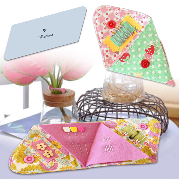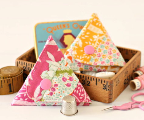 How to use the sewing travel bag template: The interior includes a felt panel for safe storage of your sewing items. Opportunity to customize your pouch with fabric and trim. The kit neatly folds into a triangle and secures with snaps or staples. Pair it with your choice of solids, prints, batik, or even wool.